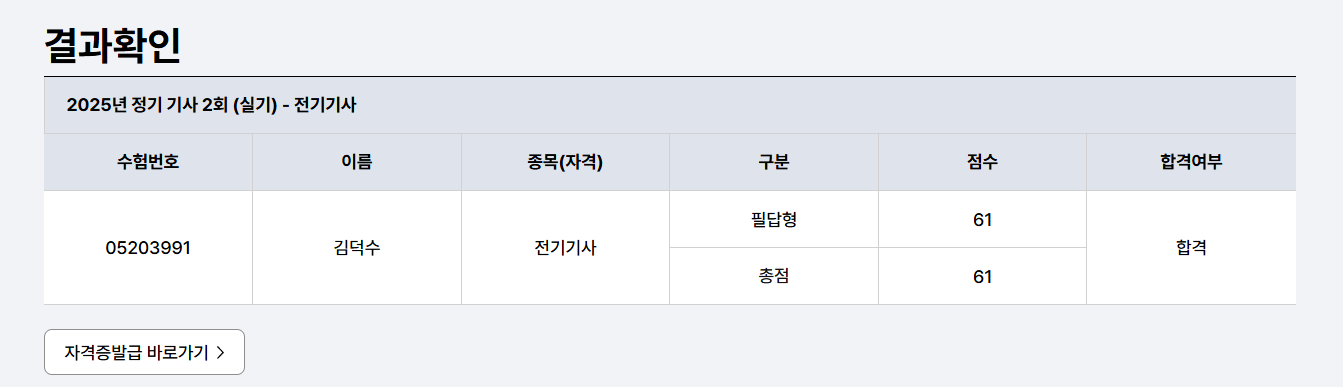 2024.1월부터 대산전기학원 인강으로 준비를 시작하여 25년 2회 전기기사 실기에 최종합격하였습니다. 필기는 8개월정도 준비하여 한번에 합격하였고, 실기는 도전 세번만에 합격할 수 있었습니다. 주간에는 근무(오피스텔 시설관리)관계로 시간이 생길때마다 강의를 수강하였고, 주말에는 가까운 도서실에 가서 하루 8시간정도 학습을 하였습니다. 주말 친구모임이나 행사는 가급적 참석을 자제하면서 최소한의 학습시간을 확보하려고 노력하였습니다. 강규대 선생님, 김민혁 선생님, 윤홍준 선생님 강의 모두 핵심위주로 구성되어 있어서 계속 반복해서 수강하였습니다. 모든 선생님께 감사의 말씀을 드립니다. 25.2회 실기시험도 예상치 못한 신출문제로 어려움이 있었지만, 풀 수있는 문제를 놓치지 않아서 합격할 수 있었던 같습니다. 역시 기본에 충실해야한다는 진리를 다시한번 확인하는 계기가 되었습니다. 올해 제나이가 67세입니다. 나이가 많아 집사람을 포함하여 주변에서 만류하는 사람도 있었습니다. 젊은 수험생보다 모든 여건이 불리하였지만, 절대로 포기하지 않고 '물들어 올때 노를 저어야 한다'는 생각으로 소방설비기사(전기)에 이어 전기기사 자격까지 취득하게 되었습니다. 앞으로 건강이 허락되는 때까지 근무를 계속할 생각을 가지고 있습니다. 대산전기학원에서 전기기사를 준비하시는 모든 분들이 노력의 결실을 거두시기를 기원합니다. 다시한번 대산전기학원 모든 강사님들에게 감사의 말씀을 드립니다.