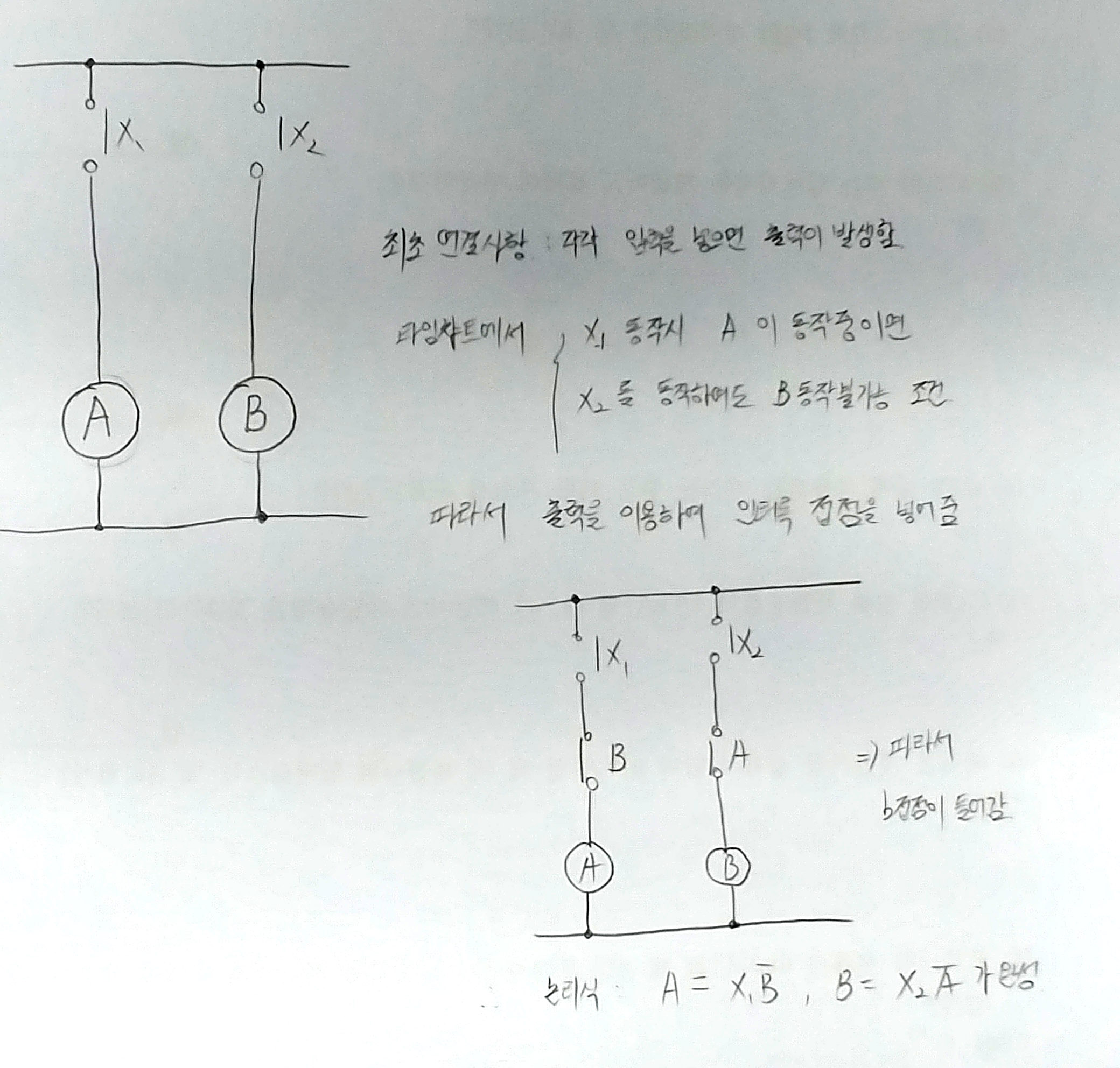 그렇다면 최초에는 X1-a 접점은 A에 대해서 직렬로, X2-a 접점은 B에 직렬로 연결이 되겠죠~?